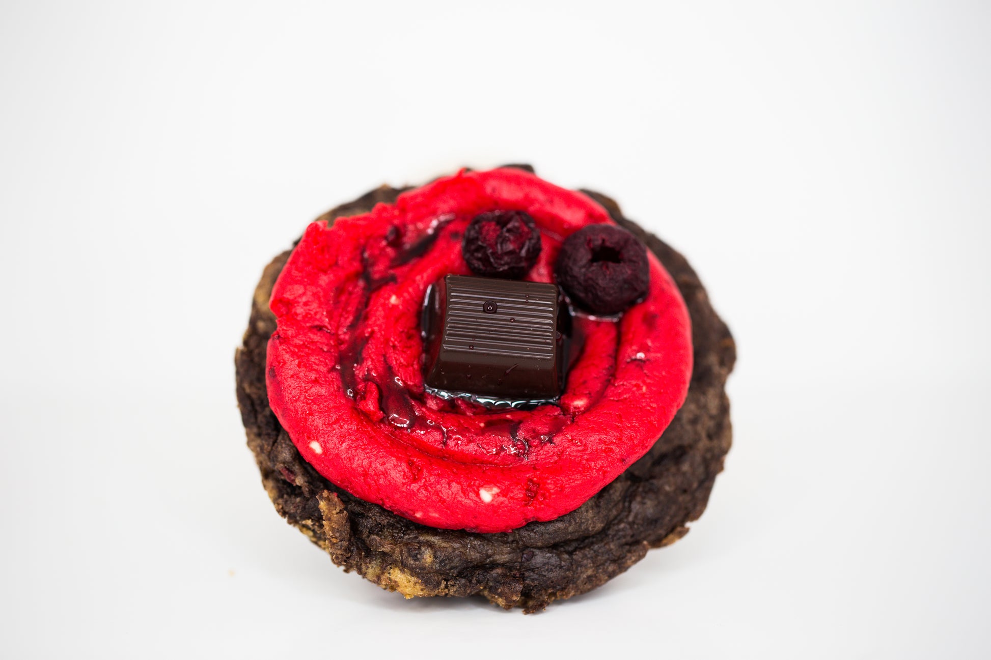 Dit zachte, chewy koekje van ±130 gram is samengesteld met Monin kersen likeur, gevriesdroogde stukjes kersen, pure chocolade chips en een heerlijke pure cacao. In het midden zit een heerljike kersen compot en het koekje is afgewerkt met een kersen frosting met stukjes kersen afgetopt met een heerlijke kersen chocolade bonbon.
