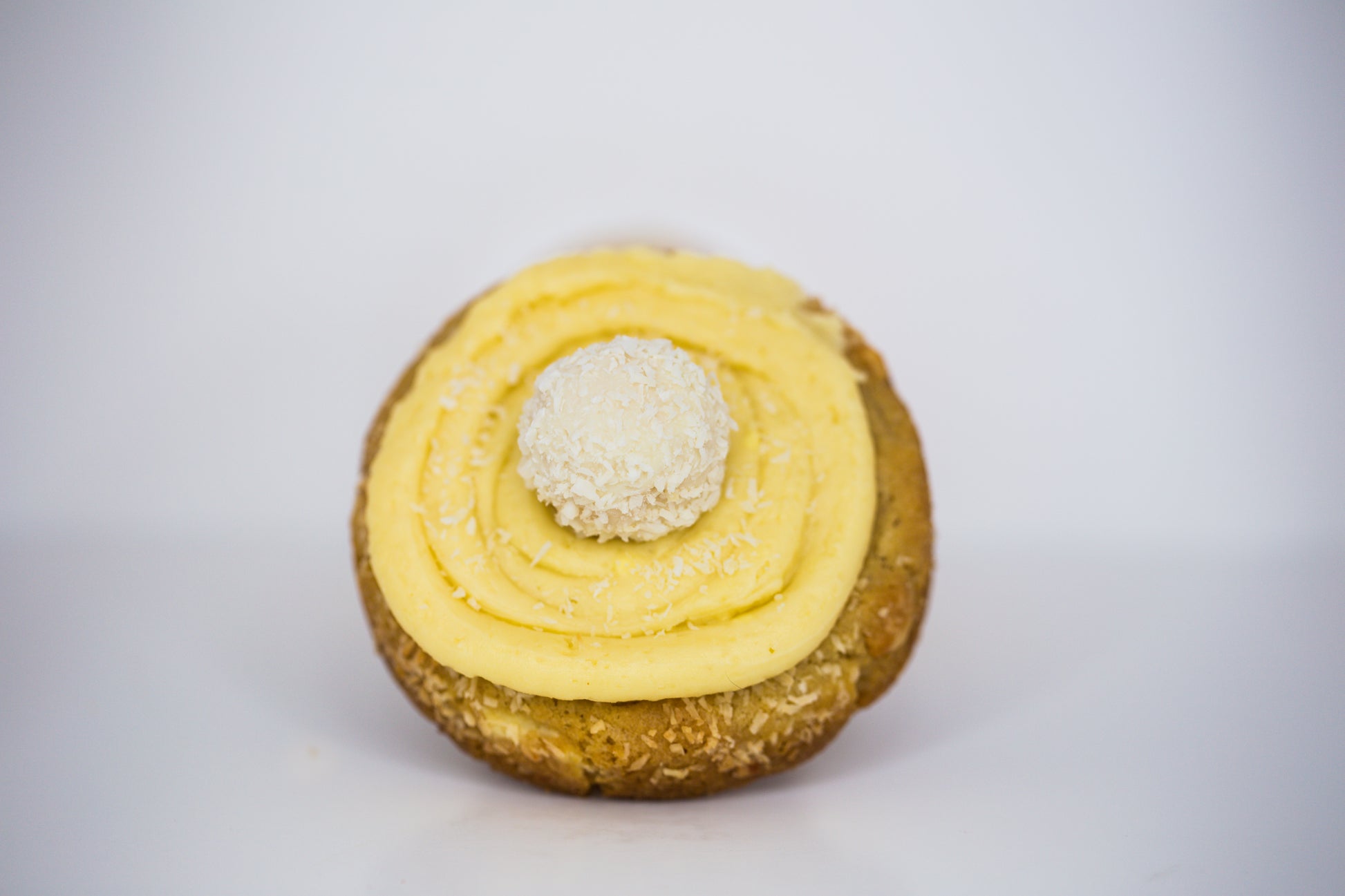 Dit zachte, chewy koekje van ±130 gram is gevuld met stukjes raffaello bonbons, kokossnippers en stukjes amandel door het hele deeg heen inclusief een vleugje Monin kokosnoot. In het midden zit een kern van witte amandel creme. Het koekje wordt afgetopt met een witte amandel kokosnoot frosting met bovenop een lekkere raffaello bonbon