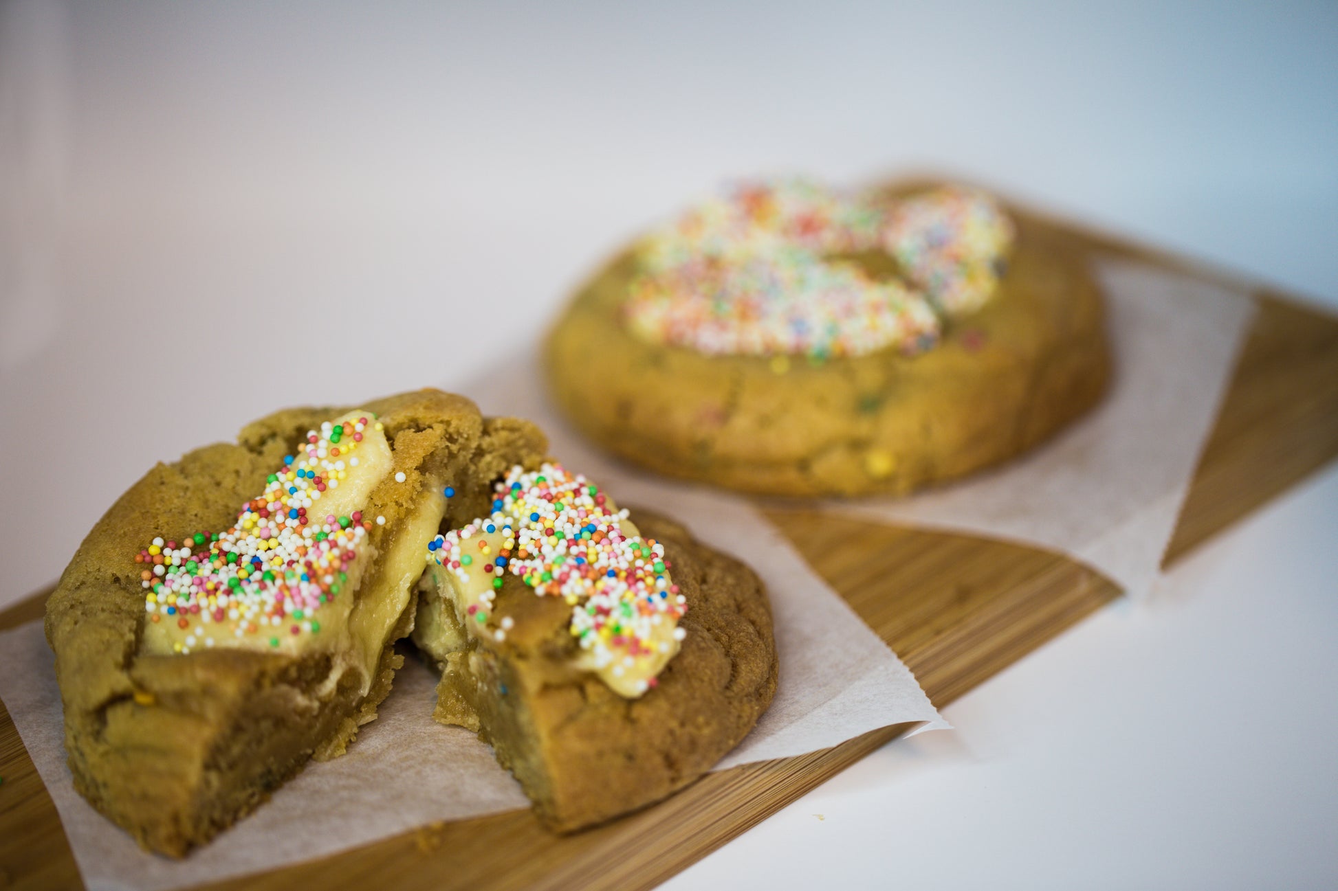 Dit zachte, chewy koekje van ±100 gram heeft een lichte bite en een volle vanillesmaak. Bovenop en binnenin bevind zich een romige vanille frosting, vrolijk afgewerkt met kleurrijke sprinkles.